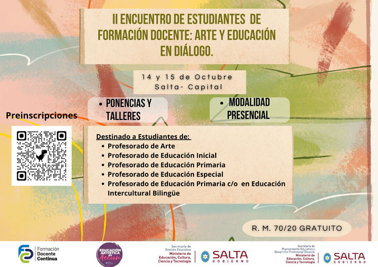 El Ministerio de Educación, Cultura, Ciencia y Tecnología, a través de Coordinación de Educación Artística, informa la realización del II Encuentro de Estudiantes de Formación Docente: Arte y Educación en Diálogo, que se llevará a cabo los días 14 y 15 de octubre de 2025 en la Casa de la Cultura, ubicada en Caseros 460, en Salta Capital.