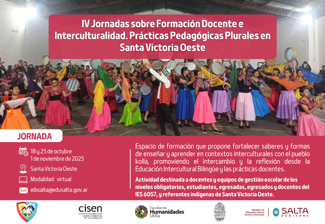 Los días 18, 25 de octubre y 1 de noviembre se realizarán las IV Jornadas sobre Formación Docente e Interculturalidad: Prácticas Pedagógicas Plurales en Santa Victoria Oeste, una propuesta organizada conjuntamente por el Instituto de Educación Superior N° 6057 de Santa Victoria Oeste, la Coordinación de Educación Intercultural Bilingüe del Ministerio de Educación, Cultura, Ciencia y Tecnología de la Provincia de Salta y el Centro de Investigaciones Sociales y Educativas del Norte Argentino (CISEN) de la Universidad Nacional de Salta.