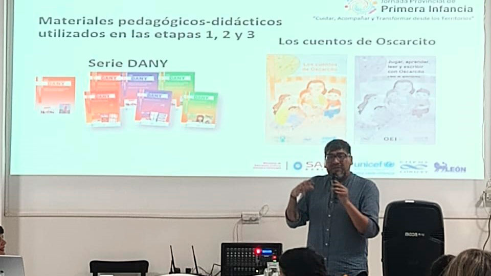 El coordinador de Educación Intercultural Bilingüe, Álvaro Guaymás, junto a Yamila Sánchez de UNICEF, expusieron la línea “Alfabetización temprana, inicial y familiar con perspectiva intercultural en el ámbito rural”. El proyecto alcanza a 230 unidades educativas de los departamentos Iruya, Santa Victoria, San Martín y Rivadavia, a través de mentorías virtuales y encuentros presenciales con equipos de supervisión, gestión escolar, docentes de grado, de salas y docentes bilingües de los niveles Inicial y Primario.